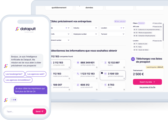 Ne laissez pas la complexité de la data vous freiner. Avec Datapult, transformez vos données en un véritable moteur de croissance. Découvrez dès aujourd’hui comment notre plateforme peut révolutionner votre approche de la prospection B2B et propulser votre entreprise vers de nouveaux sommets.